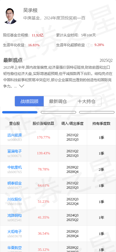 华发股份(600325)是基金经理吴承根的重仓股。,其在整个职业生涯内年化收益高达16.83%。吴承根的大佬持仓 - 战绩回顾截图如下: