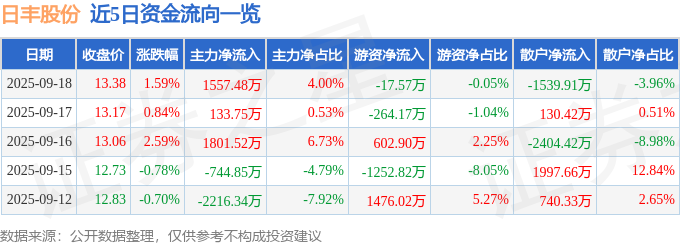 证券之星消息,截至2025年9月18日收盘,日丰股份(002953)报收于13.38元,上涨1.59%,换手率10.71%,成交量29.09万手,成交额3.89亿元。