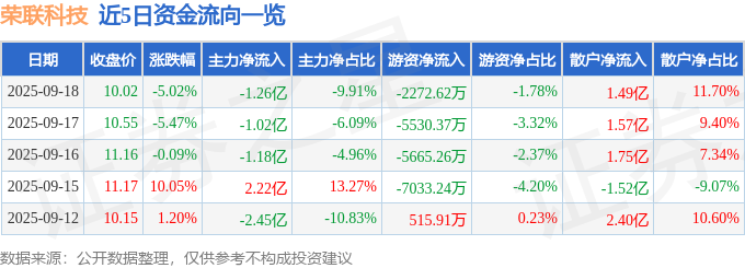 证券之星消息,截至2025年9月18日收盘,荣联科技(002642)报收于10.02元,下跌5.02%,换手率18.77%,成交量124.15万手,成交额12.74亿元。