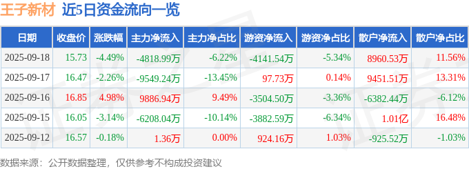 证券之星消息,截至2025年9月18日收盘,王子新材(002735)报收于15.73元,下跌4.49%,换手率17.23%,成交量48.32万手,成交额7.75亿元。
