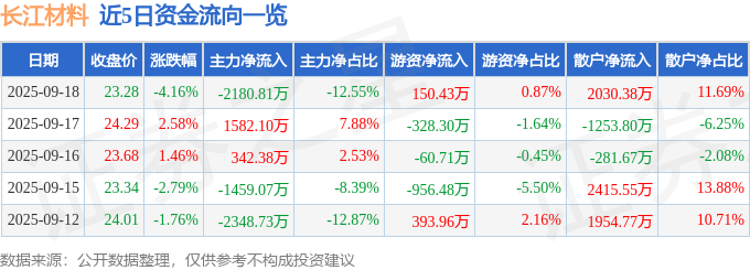 证券之星消息,截至2025年9月18日收盘,长江材料(001296)报收于23.28元,下跌4.16%,换手率9.55%,成交量7.34万手,成交额1.74亿元。