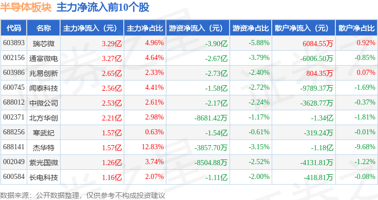 从资金流向上来看,当日半导体板块主力资金净流出43.88亿元,游资资金净流入4.39亿元,散户资金净流入39.49亿元。半导体板块个股资金流向见下表: