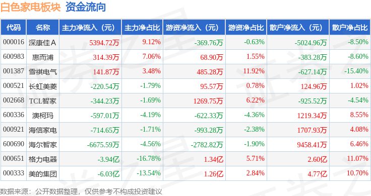 从资金流向上来看,当日白色家电板块主力资金净流出10.24亿元,游资资金净流入2.32亿元,散户资金净流入7.92亿元。白色家电板块个股资金流向见下表: