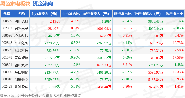 从资金流向上来看,当日黑色家电板块主力资金净流入1637.75万元,游资资金净流出3318.93万元,散户资金净流入1681.17万元。黑色家电板块个股资金流向见下表: