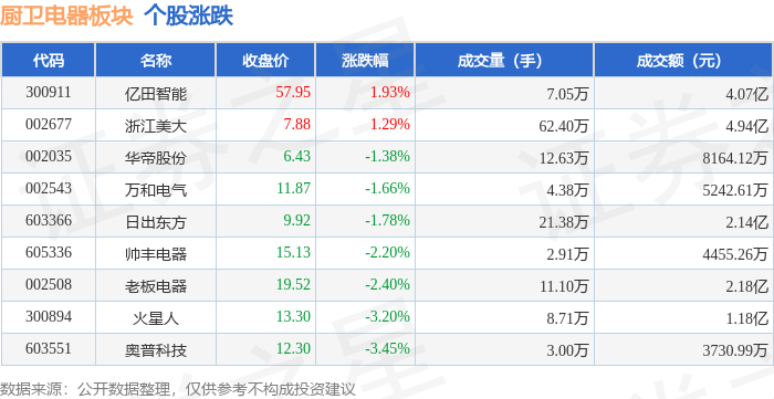 证券之星消息,9月18日厨卫电器板块较上一交易日下跌1.4%,奥普科技领跌。当日上证指数报收于3831.66,下跌1.15%。深证成指报收于13075.66,下跌1.06%。厨卫电器板块个股涨跌见下表:
