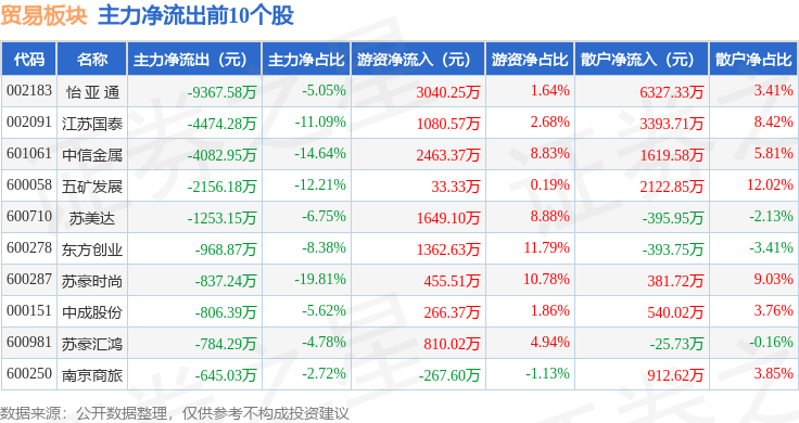 从资金流向上来看,当日贸易板块主力资金净流出2.67亿元,游资资金净流入1.16亿元,散户资金净流入1.51亿元。贸易板块个股资金流向见下表: