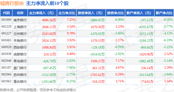 从资金流向上来看,当日城商行板块主力资金净流出4.08亿元,游资资金净流入1.85亿元,散户资金净流入2.23亿元。城商行板块个股资金流向见下表: