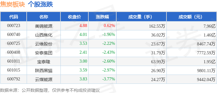 证券之星消息,9月18日焦炭板块较上一交易日下跌1.36%,云煤能源领跌。当日上证指数报收于3831.66,下跌1.15%。深证成指报收于13075.66,下跌1.06%。焦炭板块个股涨跌见下表: