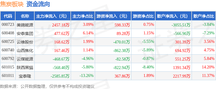从资金流向上来看,当日焦炭板块主力资金净流出352.04万元,游资资金净流出1182.43万元,散户资金净流入1534.47万元。焦炭板块个股资金流向见下表: