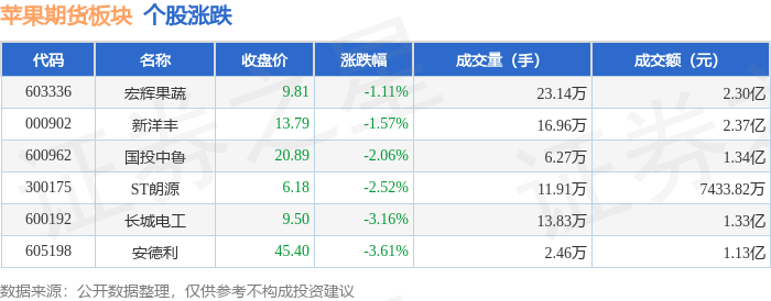 证券之星消息,9月18日苹果期货板块较上一交易日下跌2.32%,安德利领跌。当日上证指数报收于3831.66,下跌1.15%。深证成指报收于13075.66,下跌1.06%。苹果期货板块个股涨跌见下表: