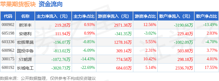 从资金流向上来看,当日苹果期货板块主力资金净流出4771.36万元,游资资金净流入5675.93万元,散户资金净流出904.57万元。苹果期货板块个股资金流向见下表: