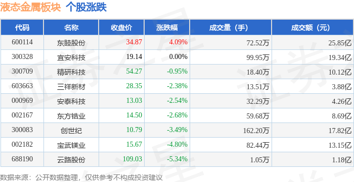 证券之星消息,9月18日液态金属板块较上一交易日下跌1.76%,云路股份领跌。当日上证指数报收于3831.66,下跌1.15%。深证成指报收于13075.66,下跌1.06%。液态金属板块个股涨跌见下表: