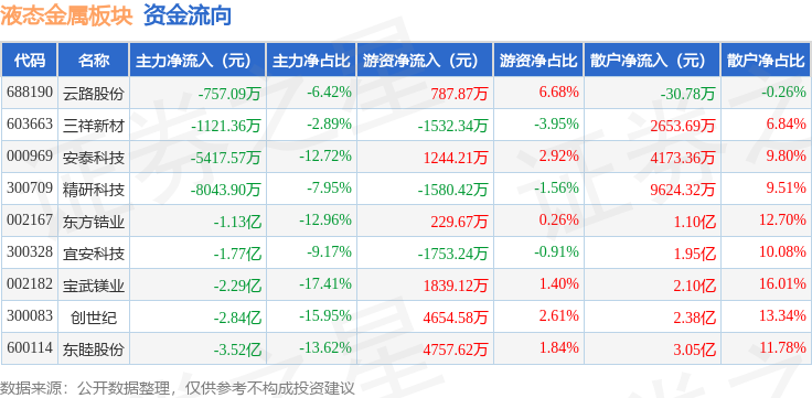 从资金流向上来看,当日液态金属板块主力资金净流出13.09亿元,游资资金净流入8647.08万元,散户资金净流入12.22亿元。液态金属板块个股资金流向见下表: