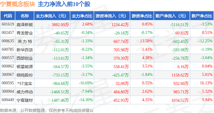 从资金流向上来看,当日宁夏概念板块主力资金净流出1.29亿元,游资资金净流入7826.13万元,散户资金净流入5058.03万元。宁夏概念板块个股资金流向见下表: