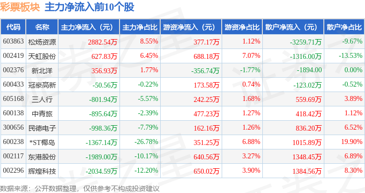 从资金流向上来看,当日彩票板块主力资金净流出3.67亿元,游资资金净流入4948.76万元,散户资金净流入3.18亿元。彩票板块个股资金流向见下表: