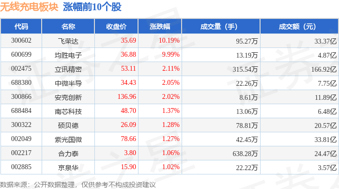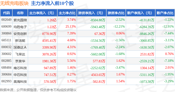 从资金流向上来看,当日无线充电板块主力资金净流出21.13亿元,游资资金净流入1.33亿元,散户资金净流入19.79亿元。无线充电板块个股资金流向见下表: