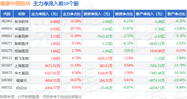 从资金流向上来看,当日健康中国板块主力资金净流入2.91亿元,游资资金净流出8965.11万元,散户资金净流出2.02亿元。健康中国板块个股资金流向见下表:
