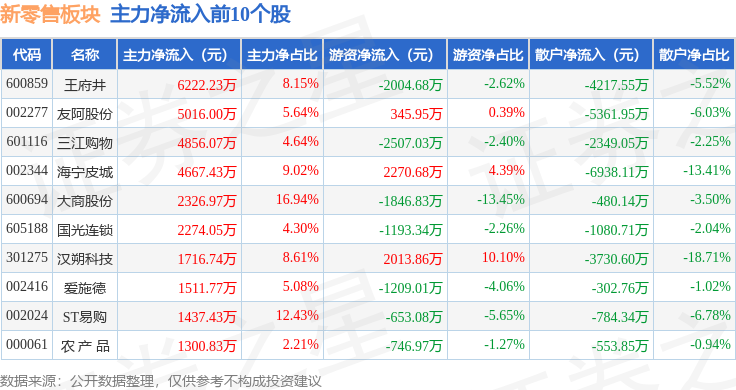 从资金流向上来看,当日新零售板块主力资金净流出13.68亿元,游资资金净流出1.78亿元,散户资金净流入15.47亿元。新零售板块个股资金流向见下表: