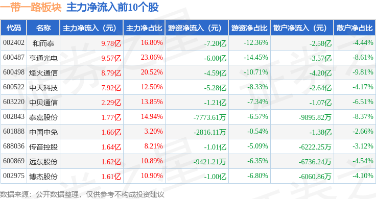 从资金流向上来看,当日一带一路板块主力资金净流出111.29亿元,游资资金净流入6.19亿元,散户资金净流入105.1亿元。一带一路板块个股资金流向见下表: