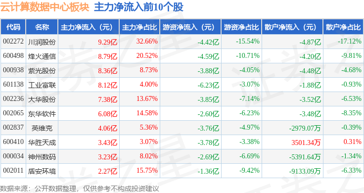 从资金流向上来看,当日云计算数据中心板块主力资金净流出50.15亿元,游资资金净流出27.95亿元,散户资金净流入78.1亿元。云计算数据中心板块个股资金流向见下表: