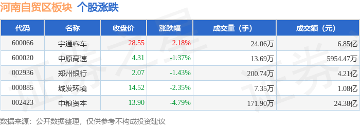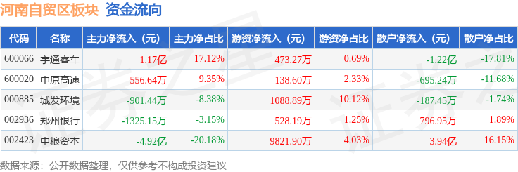 从资金流向上来看,当日河南自贸区板块主力资金净流出3.91亿元,游资资金净流入1.21亿元,散户资金净流入2.71亿元。河南自贸区板块个股资金流向见下表:
