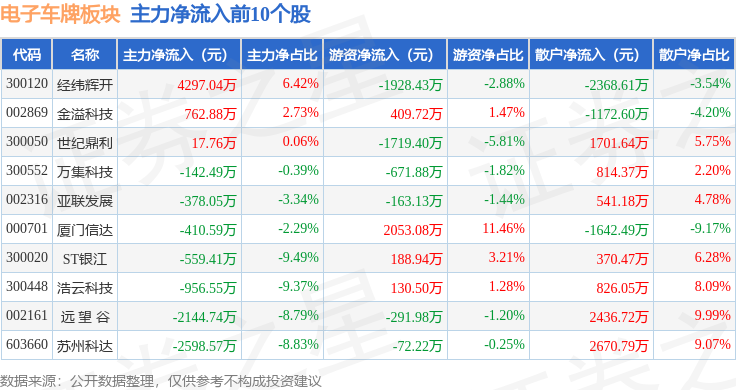从资金流向上来看,当日电子车牌板块主力资金净流出3.0亿元,游资资金净流出87.37万元,散户资金净流入3.01亿元。电子车牌板块个股资金流向见下表: