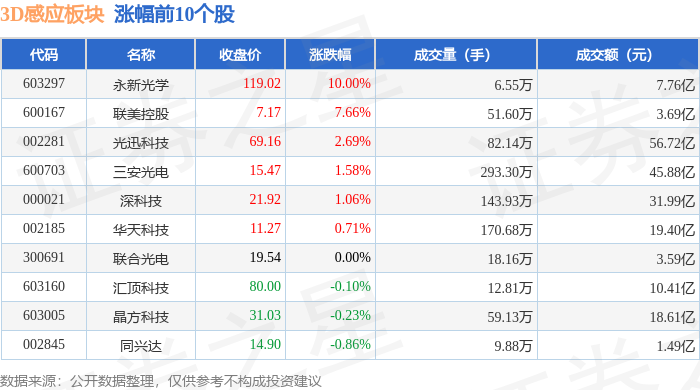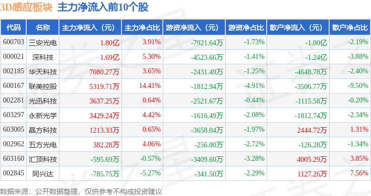 从资金流向上来看,当日3D感应板块主力资金净流出13.46亿元,游资资金净流入1.26亿元,散户资金净流入12.2亿元。3D感应板块个股资金流向见下表: