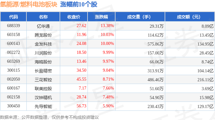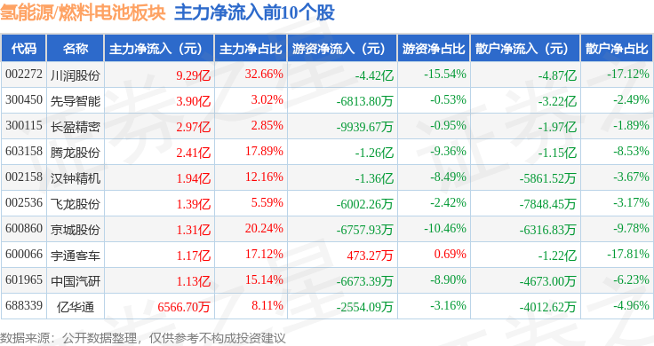 从资金流向上来看,当日氢能源/燃料电池板块主力资金净流出51.09亿元,游资资金净流出6050.86万元,散户资金净流入51.7亿元。氢能源/燃料电池板块个股资金流向见下表: