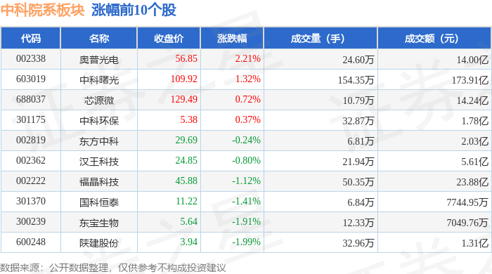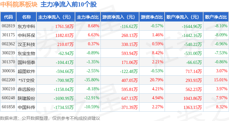 从资金流向上来看,当日中科院系板块主力资金净流出28.57亿元,游资资金净流入8.3亿元,散户资金净流入20.27亿元。中科院系板块个股资金流向见下表: