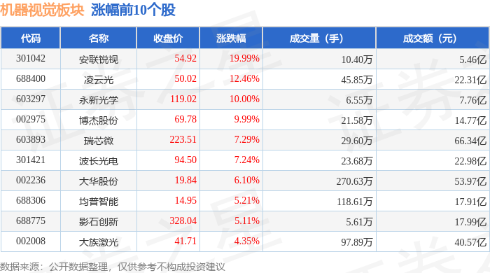 证券之星消息,9月18日机器视觉板块较上一交易日上涨0.37%,安联锐视领涨。当日上证指数报收于3831.66,下跌1.15%。深证成指报收于13075.66,下跌1.06%。机器视觉板块个股涨跌见下表: