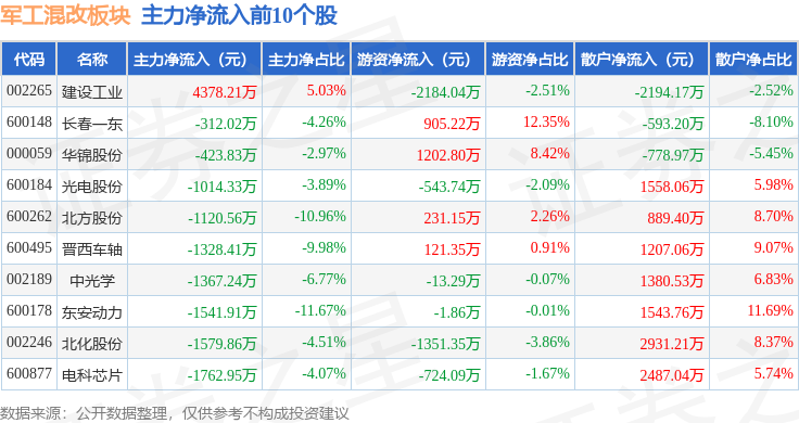从资金流向上来看,当日军工混改板块主力资金净流出26.45亿元,游资资金净流入4.03亿元,散户资金净流入22.42亿元。军工混改板块个股资金流向见下表: