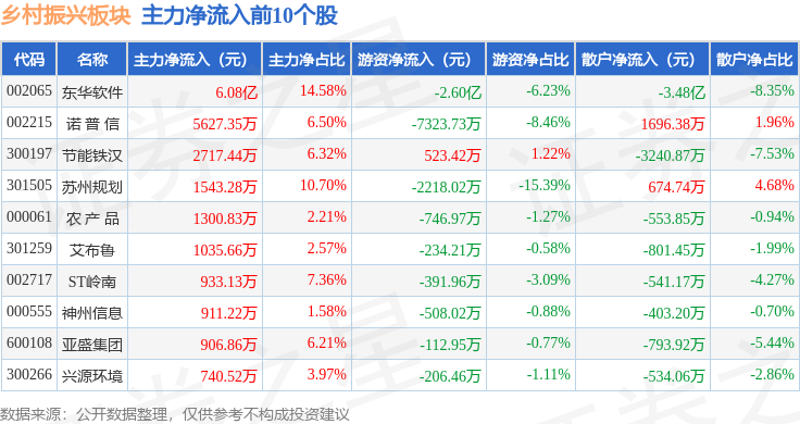 从资金流向上来看,当日乡村振兴板块主力资金净流出2.49亿元,游资资金净流出2.73亿元,散户资金净流入5.22亿元。乡村振兴板块个股资金流向见下表: