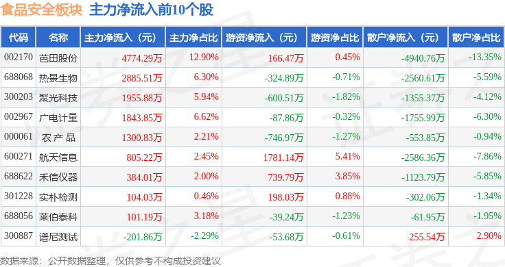 从资金流向上来看,当日食品安全板块主力资金净流出11.02亿元,游资资金净流入2.42亿元,散户资金净流入8.6亿元。食品安全板块个股资金流向见下表: