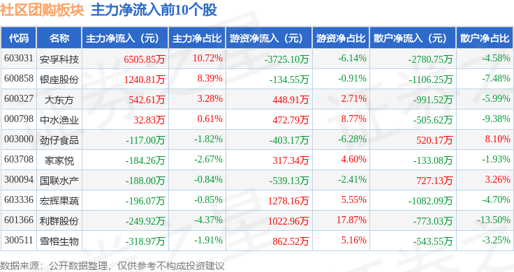 从资金流向上来看,当日社区团购板块主力资金净流出10.57亿元,游资资金净流入1882.45万元,散户资金净流入10.38亿元。社区团购板块个股资金流向见下表: