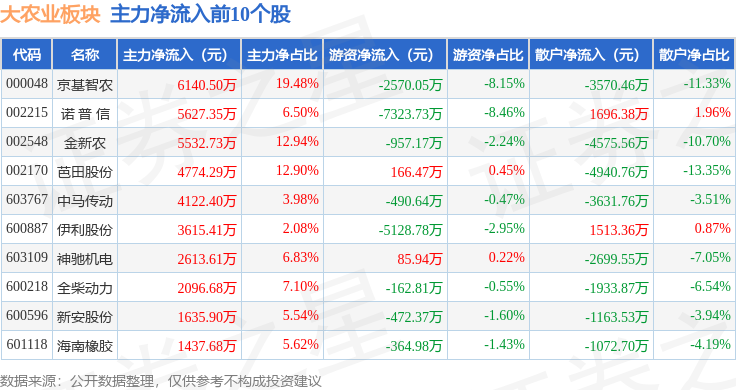从资金流向上来看,当日大农业板块主力资金净流出34.9亿元,游资资金净流入7.09亿元,散户资金净流入27.81亿元。大农业板块个股资金流向见下表: