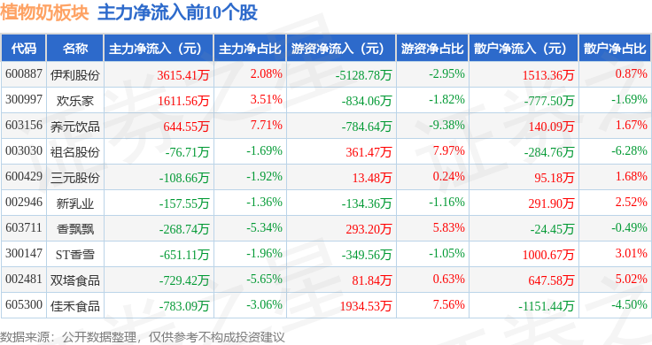 从资金流向上来看,当日植物奶板块主力资金净流出1.01亿元,游资资金净流出2569.1万元,散户资金净流入1.27亿元。植物奶板块个股资金流向见下表: