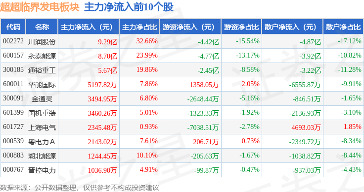 从资金流向上来看,当日超超临界发电板块主力资金净流入12.93亿元,游资资金净流出8.14亿元,散户资金净流出4.8亿元。超超临界发电板块个股资金流向见下表:
