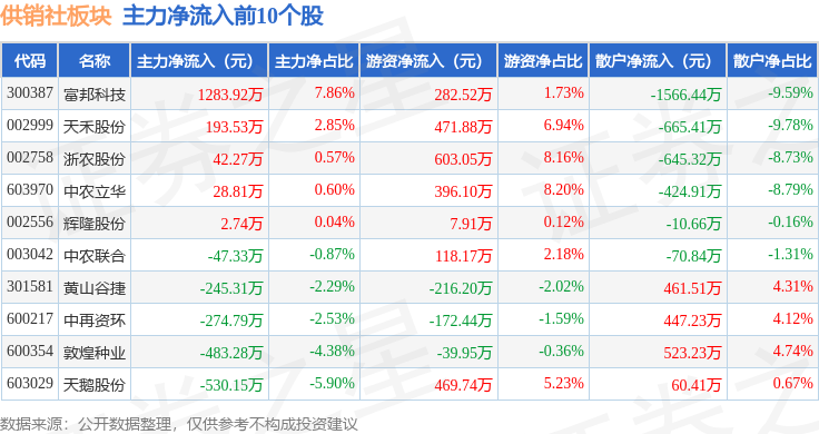 从资金流向上来看,当日供销社板块主力资金净流出4.19亿元,游资资金净流出1174.39万元,散户资金净流入4.31亿元。供销社板块个股资金流向见下表: