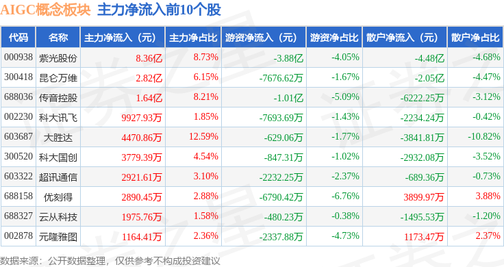 从资金流向上来看,当日AIGC概念板块主力资金净流出19.96亿元,游资资金净流出4.08亿元,散户资金净流入24.04亿元。AIGC概念板块个股资金流向见下表: