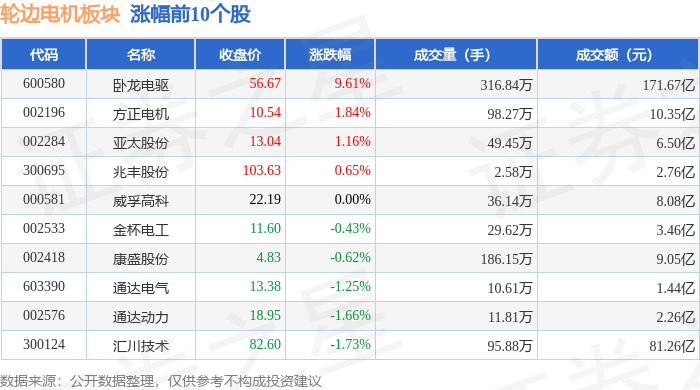 证券之星消息,9月18日轮边电机板块较上一交易日上涨0.52%,卧龙电驱领涨。当日上证指数报收于3831.66,下跌1.15%。深证成指报收于13075.66,下跌1.06%。轮边电机板块个股涨跌见下表: