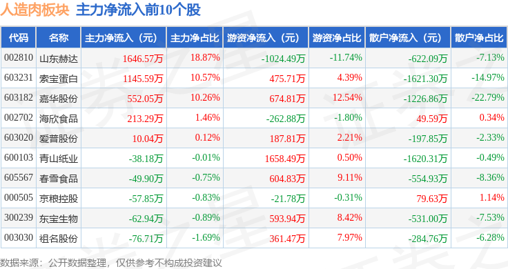 从资金流向上来看,当日人造肉板块主力资金净流出4.53亿元,游资资金净流入2.08亿元,散户资金净流入2.45亿元。人造肉板块个股资金流向见下表: