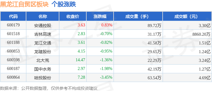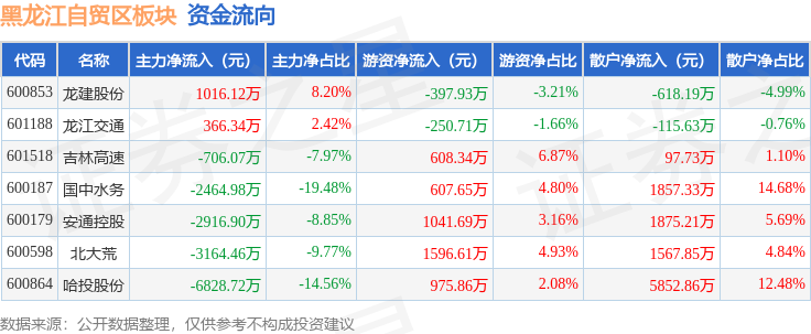 从资金流向上来看,当日黑龙江自贸区板块主力资金净流出1.47亿元,游资资金净流入4181.51万元,散户资金净流入1.05亿元。黑龙江自贸区板块个股资金流向见下表: