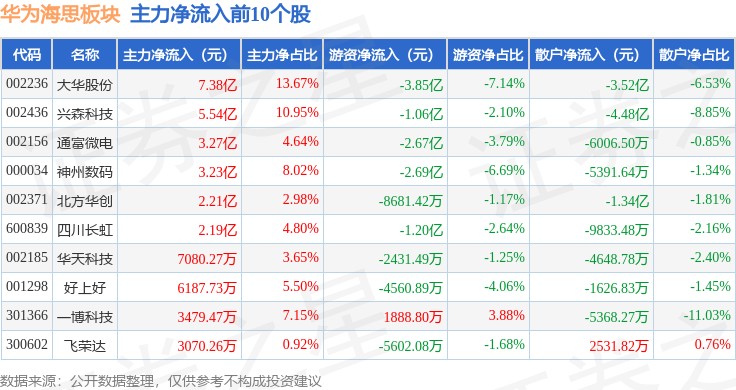 从资金流向上来看,当日华为海思板块主力资金净流入4.72亿元,游资资金净流出9.52亿元,散户资金净流入4.8亿元。华为海思板块个股资金流向见下表:
