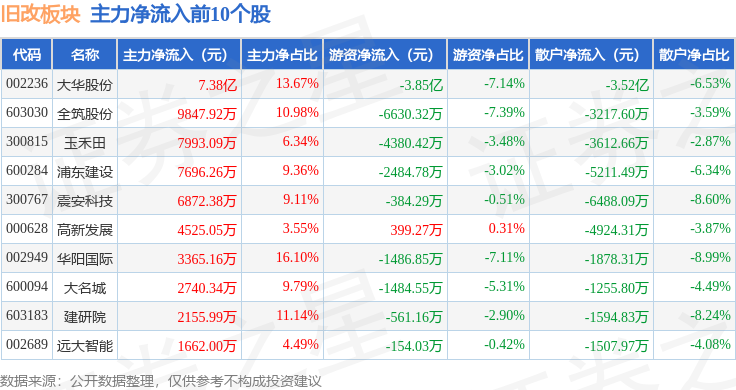 从资金流向上来看,当日旧改板块主力资金净流出12.37亿元,游资资金净流入326.22万元,散户资金净流入12.33亿元。旧改板块个股资金流向见下表:
