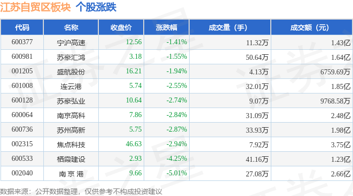 证券之星消息,9月18日江苏自贸区板块较上一交易日下跌2.22%,南 京 港领跌。当日上证指数报收于3831.66,下跌1.15%。深证成指报收于13075.66,下跌1.06%。江苏自贸区板块个股涨跌见下表: