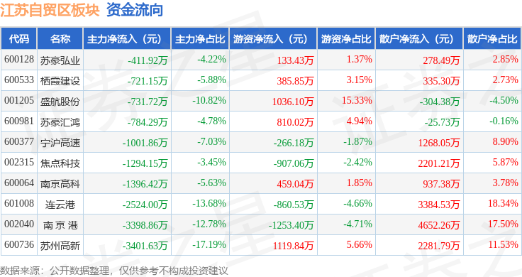从资金流向上来看,当日江苏自贸区板块主力资金净流出1.57亿元,游资资金净流入657.12万元,散户资金净流入1.5亿元。江苏自贸区板块个股资金流向见下表:
