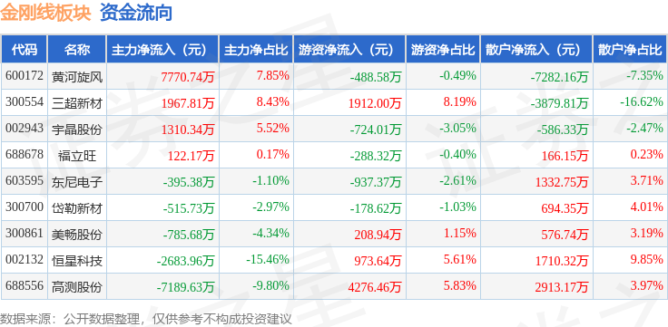 从资金流向上来看,当日金刚线板块主力资金净流出399.32万元,游资资金净流入4754.14万元,散户资金净流出4354.82万元。金刚线板块个股资金流向见下表: