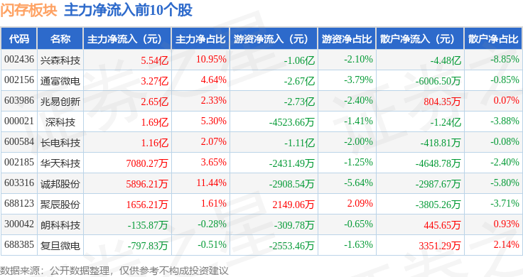 从资金流向上来看,当日闪存板块主力资金净流出11.09亿元,游资资金净流入7625.35万元,散户资金净流入10.33亿元。闪存板块个股资金流向见下表: