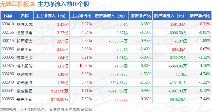 从资金流向上来看,当日无线耳机板块主力资金净流出38.22亿元,游资资金净流出6.83亿元,散户资金净流入45.04亿元。无线耳机板块个股资金流向见下表: