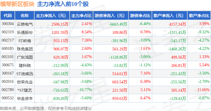 从资金流向上来看,当日横琴新区板块主力资金净流出4.06亿元,游资资金净流出2603.42万元,散户资金净流入4.32亿元。横琴新区板块个股资金流向见下表: